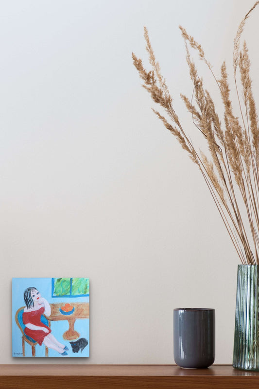Woman in Red Dress & Orange Cat by Peggy Hinaekian